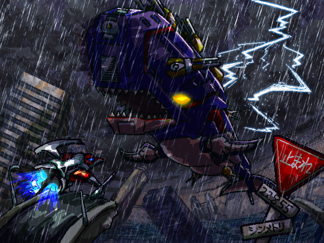 雷が光るなら照り返しもあるだろう、ということでデカブツの縁をちょっと白くしてます。