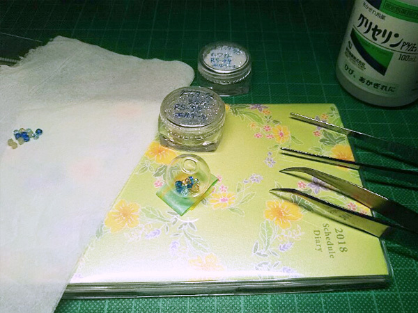 詰めたのはスワロフスキービーズとラメ数種。本当は星の砂も封入したかったのですが、