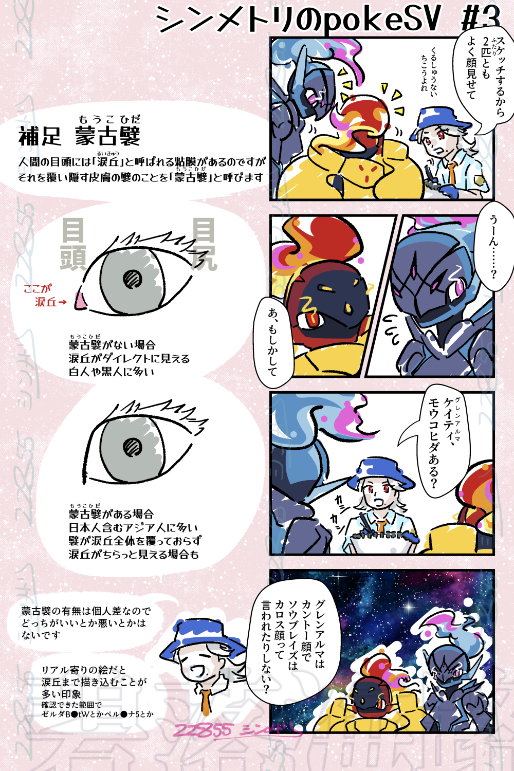モウコヒダ 描いた 2022.12.312023.12.08 続きました。 カスタム主人公ちゃんとニックネーム付きのポケモンがわいのわいのしてます。 一応ネタバレ扱いとして追記形式にしています。 美容系やメイク系だと十中八九避けて通れない話題「蒙古襞」です。 2匹を進化させて真っ先に気づいたのが「あれ?2匹(ふたり)の目つき違うくね?」でした。 お気に入りのコマは宇宙カルボウ族。 今年はまさかのポケモンSVでカルボウ族に狂わされました。 来年はもっとこの子達描きます。 良いお年を。