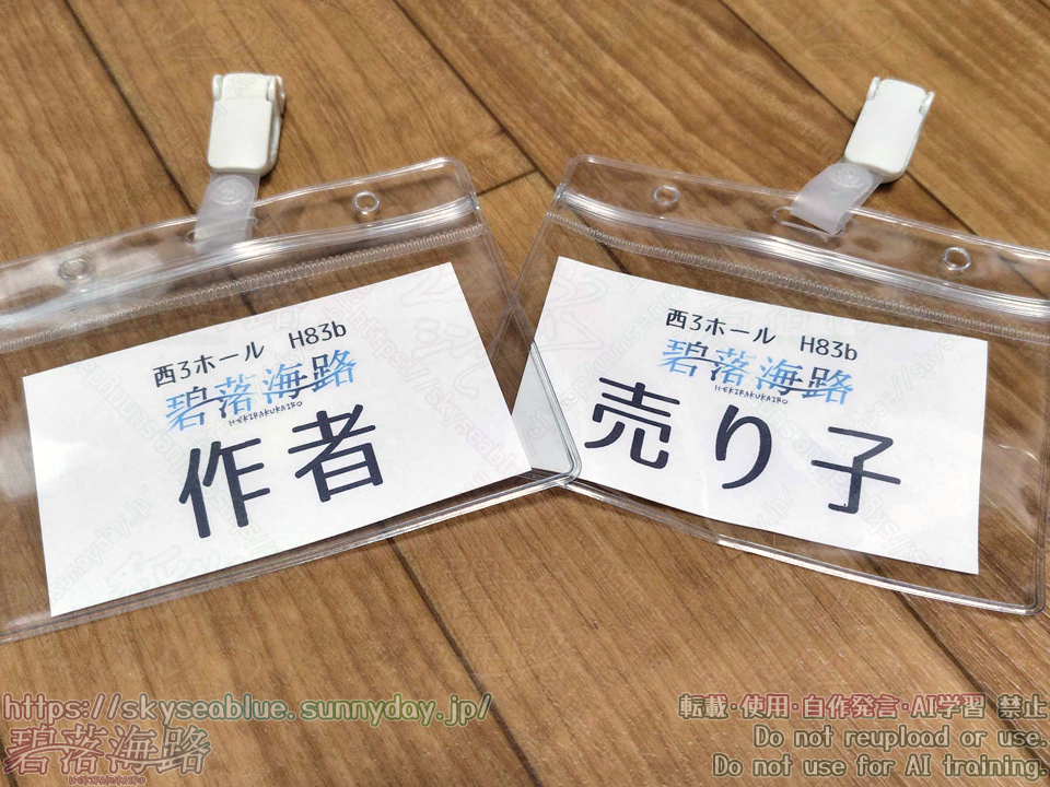 あと当日、別のホールのサークルさんに挨拶に行った後、見事に帰り道が分からなくなってしまい、イベントスタッフに名札を見せ「ここに帰りたいんです」と伝えました。まさか本当に迷子札と同じ用途で使うとは。