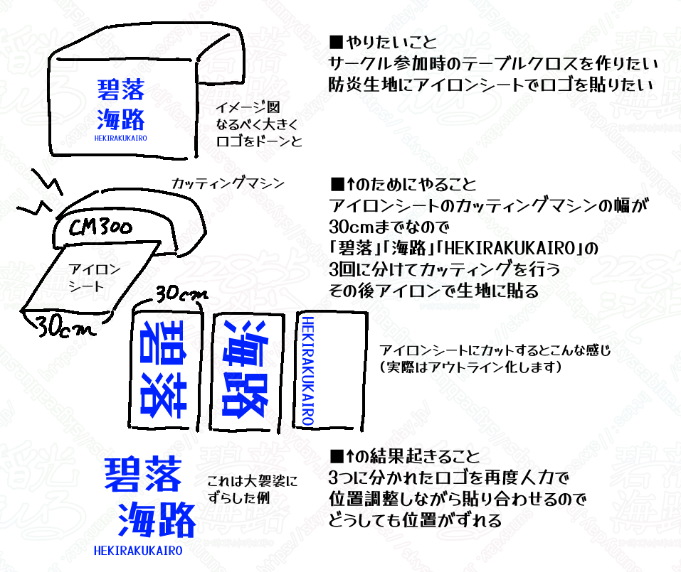 上記の「テーブルクロス」で軽く触れた「カッティングマシンのカット範囲の都合でロゴを3分割してカットし、アイロンで貼り合わせる」も、「ロゴを三分割する」「人力で位置合わせをするのでどうしても位置がずれる」がロゴの改変に当たる恐れがあったため、予めデザイナーさんに筋を通した次第です。