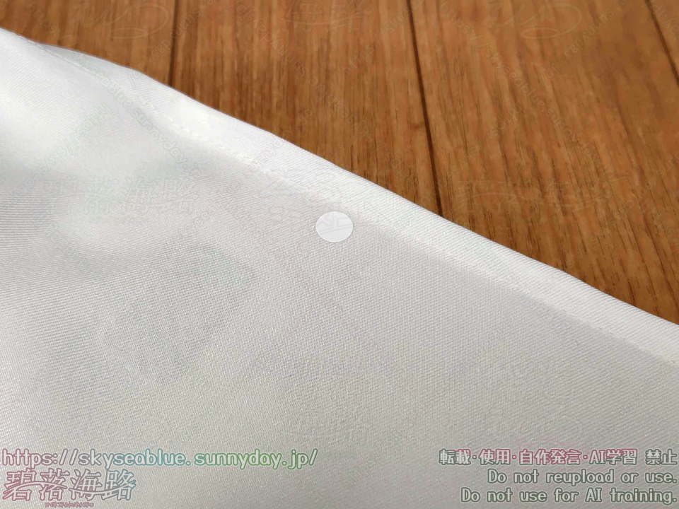 また同系色のアイロンシートをカットし、前面裾から61cmの位置に貼りました。前面には60cm布を垂らす計算なので、この印を一般参加側テーブルの角に合わせてテーブルクロスをセッティングすれば自動的に長さが合うという仕掛けです。
