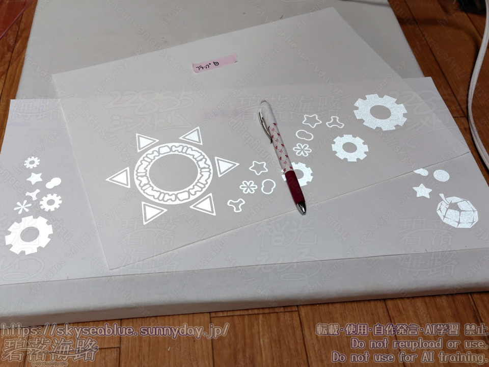 空白部分にも適当に図案を作って詰め込んでカットしています。とりあえずマホロアをイメージした歯車模様等はついででいっぱい切り抜いてあります。何処に貼るかは何も決めていなかった。