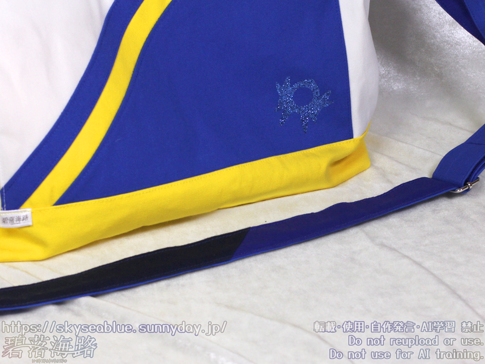 マホロアってあまりゴテゴテ装飾して主張するキャラクターじゃないよなーと。ならば生地とアイロン反射シートの色を同じにしてなじませて、フラッシュが当たった瞬間に模様が浮かび上がる方がそれっぽいかなと。