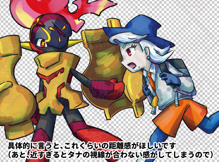 タナ(人間)とケイティ(グレンアルマ)の距離がちょっと近すぎて「ケイティがタナの肩を抱き寄せようとしている」に見えてしまうので、この2人の距離を離すことは可能ですか?具体的に言うとケイティの握りこぶし1つ分くらい離れてると嬉しいかなと。